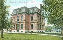 The school is located in a single building on the corner of Broad and Summer streets in downtown Claremont. The front of the building is the original structure, built in 1868, which consists of three floors of classrooms (including lab facilities for science classes) and administrative offices. It has been renovated several times over the years. Behind this are two expansions, one in the middle that includes three floors of classrooms and a gymnasium, and another annexation in the back, which holds two floors of classrooms and the cafeteria.[3] The school has no student parking facilities and relies on the city's parking spaces along the median in front of the building, as well as street parking along Broad Street and Summer Street. Owing to its central location, the school does not have its own athletic fields, and instead has an agreement with the city of Claremont to use the city's facilities at neighboring Monadnock Park and Barnes Park.[9][10]