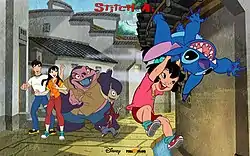 | Stitch is held captive on a spaceship above Earth by an alien faction called the Jaboodies, who want to use him against his own will to win a space war against their enemies, the Woolagongs. However, the Woolagongs themselves attack the ship wanting Stitch for themselves, accidentally freeing him in the process during the fight and allowing him to escape back to Earth. Upon re-entering Earth's atmosphere, Stitch lands in China's Huangshan mountains where he meets orphaned Chinese girl Wang Ai Ling. Her aunt Daiyu has told her that she will be forcibly moved out of her mountain home and separated from her older sister Jiejie to live in a city. The two quickly bond as the girl shows the blue alien around the mountains. Stitch desires to find a shrine he's been seeing in visions he had, but once Ai takes him to a shrine that does not match the one in his visions, they soon find themselves pursued by both alien factions. Ultimately, Stitch and Ai lead them on a goose chase around the mountains, causing a number of both factions' soldiers to be knocked out and forcing them to teleport away to regroup. When Stitch and Ai finally arrive at the latter's house, Daiyu sees the unusual and "ugly" Stitch and freaks out, calling for Jiejie, but when she turns her back, Stitch curls into a ball and Ai pretends to be playing with the blue "ball". After Jiejie brings Daiyu back inside, Stitch then tells Ai that the two of them will find a way to get her to stay in the mountains where she belongs. | ||||