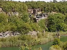 Stockton has long been associated with the manufacture of lime and cement.[3] The village is surrounded by areas of blue lias clay, a raw material used in cement manufacture. This is reflected in the name of a nearby pub, the 'Blue Lias', beside the Grand Union Canal on the road to Long Itchington (the title-deeds of the pub date back to 1809). As early as the 1850s workings in the area were extensive and the quarries in Stockton were among the first to be dug.[4] By the early 20th century, Mssrs Charles Nelson and Co Ltd operated a large cement works half-a-mile north of the village which was closed and demolished in 1949.[5] The extensive quarries remain and are known locally as the 'cally pits'.