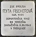Edita Fischerová was born on 24 April 1935 in Kolín. Her parents were Alfred Fischer and Martanée Eckstein. She and her sister Eugenie (born in 1931) grew up in Kolín, she also had an older brother, Karel (born 1918). On 13 June 1942, the girl, her sister and her parents were arrested and deported to Theresienstadt concentration camp by transport AAd. Her transport number was 59 of 736. Four months later, on 8 October 1942, the family was deported to Treblinka extermination camp. Her transport number was 43 of 1,000. There, mother, father and the two daughters were murdered by the Nazi regime. Edita Fischerová was 7 years old.[17][18]