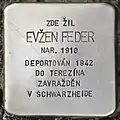 Evžen Feder was born on 20 June 1910 in Gablonz. His parents were Richard Feder, the rabbi of Kolín, and Hilda. He had an older sister, Ruth (born on 19 December 1908 in Gablonz), and a younger brother, Viktor (born on 16 April 1915 in Kolín). He was married to Růžena (born 1915). The couple had one son, Josef (born 1941). On 13 June 1942, Evžen Feder, his wife, his son, his parents, his sister, his brother-in-law and his nephew were arrested and deported to Theresienstadt concentration camp by transport AAd. His transport number was 666 of 736. At that point, his brother Viktor, who was in Theresienstadt from January to April 1942, had already been deported to Zamość and been murdered by the Nazi regime.[2][3] Thereafter, the family was systematically destroyed and nearly extinct. While his father served as a rabbi for the desperate inmates and tried to give them hope, his mother suffered from the conditions in the camp and died on 24 December of the same year. Nearly two years after their arrival, Evžen Feder, his wife and his son were separated from their family members and deported to Auschwitz concentration camp on 15 May 1944 by transport Dz. His transport number was 387 of 2,501. There, father, mother and son, age two and a half years, were murdered.[4][5][6]