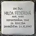 Hilda Federová was born on 24 February 1888. She was married to Rabbi Richard Feder. The couple had three children, Ruth (born 1908 in Gablonz), Evžen (born 1910 in Gablonz) and Viktor (born 1915 in Kolín). Her last residence before deportation was in Kolín. On 13 June 1942, Hilda Federová and her family were arrested and deported to Theresienstadt concentration camp by transport AAd. His transport number was 664 of 736. She died there on 24 December 1942.[11]