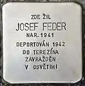 Josef Feder was born on 13 October 1941 in Kolín. He was the only son of Evžen Feder and Růžena Federová. Still as a baby, on 13 June 1942, he, his parents, his grandparents, aunt, uncle and cousin were arrested and deported to Theresienstadt concentration camp by transport AAd. His transport number was 668 of 736. His family was systematically destroyed and nearly extinct by the Nazi regime. Even before his arrival, his uncle had been deported to Zamość. His grandmother died on 24 December of the same year. Nearly two years after their arrival, the little boy and his parents were separated from the other family members and deported to Auschwitz concentration camp on 15 May 1944 by transport Dz. His transport number was 389 of 2,501. There, Josef Feder, age two and a half years, and his parents were murdered.[10]