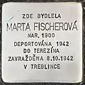 Marta Fischerová née Eckstein was born 1 May 1900 in Kolín. Her parents were Eduard Eckstein and Filipa née Freund. She had four siblings, Adolf (born 1890), Růžena (born 1893, later Glöcknerová), Josef (born 1897) and František (born 1906). She was married to Alfred Fischer. The couple had three children, Karel (born on 13 June 1918), Eugenie (born 1931) and Edita (born 1935).[21] The last residence of the family before deportation was in Kolín. On 13 June 1942, Marta Fischerová, her husband and her little daughters were arrested and deported to Theresienstadt concentration camp by transport AAd. Her transport number was 57 of 736. Four months later, on 8 October 1942, the family was deported to Treblinka extermination camp. Her transport number was 41 of 1,000. There, mother, father and the two daughters were murdered by the Nazi regime.[22][23]