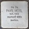 Pavel Meisl, also Paul, was born on 16 March 1902 in Kolín. His parents were Albert Meisl and Růžena née Weisberger. He had two sisters and one brother: Gusta (born 1895), Anna (born 1897) and František (born 1900). His last place of registration in the Protectorate was in Prague XIII, Ruská 64. He was murdered by the Nazi regime. The whereabouts of his death are not known.[40][41]