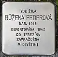 Růžena Federová was born on 16 March 1915. She was married to Evžen Feder. The couple had one son, Josef (born 1941). On 13 June 1942, Růžena Federová and her family, the parents and sister of her husband were arrested and deported to Theresienstadt concentration camp by transport AAd. Her transport number was 667 of 736. Nearly two years after their arrival, she, her husband and their son were separated from the other family members and deported to Auschwitz concentration camp on 15 May 1944 by transport Dz. Her transport number was 388 of 2,501. There, father, mother and son, age two and a half years, were murdered.[12]