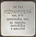 Her last residence before deportation was in Kolín. On 13 June 1942, she, her sister Hedvika, her daughter Gusta and her son-in-law Leo Schmolka were arrested and deported to Theresienstadt concentration camp by transport AAd. Their transport numbers were 84, 85 and 345 of 736. Already there were her daughter Anna with her husband (since 8 February) and her son František (since 7 May). Step by step the whole family was torn apart and extinct. On 1 September 1942, daughter Anna and her husband were deported to Raasiku. On 8 October 1942, her daughter Gusta and her husband were deported to Treblinka extermination camp. On 11 January 1943, Růžena Meislová was brought to death in Theresienstadt.[45][46]