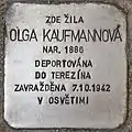 Olga Kaufmannová née Ehrmann was born on 14 February 1886 in Osek, Písek District. She was the daughter of Sigmund or Zigmund Ehrmann (1854-1935) and Julia née Kafka, also Julie or Yulia (1854-1939). She had two brothers and three sisters: Martha (later named Weiskopf, 1884-1942), Fanny (later named Klein, 1888-1943), Rudolf (1891-1983), Jindra (1895-1975) and Ida (later named Bergman, dates of birth and death unknown). She married Hugo Kaufmann. The couple had at least three sons, Bedřich (born 1911), Robert (born 1913) and Hanuš (born 1917). It is not known how and when she arrived at Auschwitz concentration camp. But she is listed in the Auschwitz Death Registers. She lost her life on 7 October 1942 in Auschwitz.[14][15]