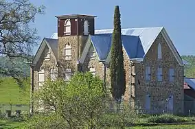 The original tower was built entirely of stone and designed for defense against unwelcome visitors, because the area was considered "bandit country," with no organized law enforcement agency at the time. The top of the tower was crenellated, giving it a fortress-like appearance and providing some protection to the defenders. However, an earthquake in 1868, severely damaged the tower, and it needed to be mostly rebuilt. The rebuilt tower had a wood top that imitated the former castellated stone and the vertical wood surfaces covered with shingles. The shingles were painted about 1925.[1]