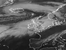 Satellite image of the plume of moist air, known as an atmospheric river, brought to Western Europe by Desmond