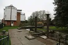 This corn mill stood on the site of a medieval mill owned by the Abbot. The building dated from 1792 and was originally designed as a granary by John Smeaton. In 1794 it was converted into a watermill by Joseph Royle and James Simmons.[30] The building was 60 feet (18.29 m) square in plan, and six storeys tall. The base was brick and the upper five storeys were wood, clad in white painted weatherboarding. At the time it was built, it was the second tallest building in Canterbury, after the Cathedral. There were two waterwheels each 12 feet (3.66 m) diameter and 6 feet (1.83 m) diameter driving a total of eight pairs of stones.[31] In 1896 it was bought by Denne's. The mill was destroyed by fire on 17 October 1933.[32] The cast-iron axle survives on site.[33]