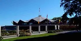 Fundraising to build a permanent theatre was slow but was helped significantly by donations from Governor General Vincent Massey and the Perth Mutual Insurance Company. The new Festival Theatre was dedicated on 30 June 1957, with seating for over 1,800 people; no seats are more than 65 feet from the stage. The design was deliberately intended to resemble a huge tent.[8] That season's productions included Hamlet, Twelfth Night, the satirical My Fur Lady, The Turn of the Screw and Ibsen's Peer Gynt.