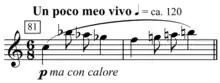 The movement again begins with the "Mesto" theme, this time in a slightly thinner texture than in the previous movement with three of the members of the quartet. This version of the slow introduction also features canonic elements, like in m. 7. The viola enters in m. 10, providing a harmony of stacked thirds.[11] It seems that Bartók uses similar devices in this movement as the previous. After the slow introduction, Bartók pairs different instruments off again, as seen in m. 26. The movement also features different pizzicato effects as well as quarter-tone slides in mm. 26-29, giving the movement a humorous slant.[12]