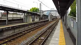 The station has two opposed side platforms, connected by a footbridge. The station building has automated ticket machines, TOICA automated turnstiles and is staffed.