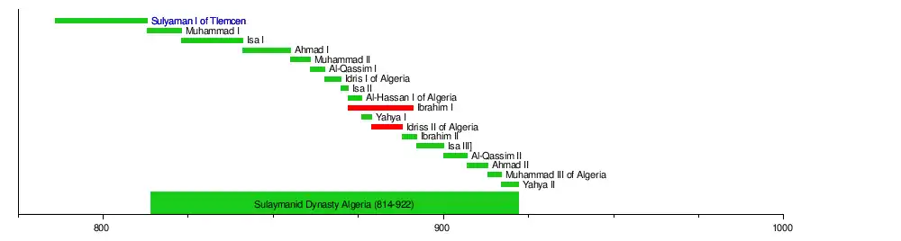 The Sulaymanid dynasty (Arabic: السليمانيون, romanized: as-Sulaymāniyyūn) was an Arab Muslim dynasty in present-day western Algeria, ruling from 814 to 922. The dynasty is named after the founder, Sulyaman I, who was the brother of Idris I, the founder of the Idrisid dynasty based in Fez (present-day Morocco).[1] Both Sulayman and Idris, as great grandchildren of Hasan ibn Ali, were sharifs descended from Muhammad.