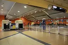 Sultan Ismail Petra Airport (IATA: KBR, ICAO: WMKC) is an airport that operates in Kota Bharu, a city in the state of Kelantan in Malaysia. The airport is named after Ismail Petra of Kelantan, the 28th Sultan of Kelantan, who ruled from 1979 to 2010. The present new terminal was officially opened in September 2002. The 12,000 m2 airport terminal has three aircraft stands, three aerobridges and is able to handle maximum capacity 1.45 million passengers. The airport consists of 9 check-in counters and offers flights between a total of 7 domestic destinations from Malaysia Airlines, AirAsia, Firefly, MYAirline, and Malindo Air. In 2014, this made it the busiest airport in the East Coast.
