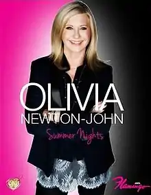 Rumors of a Vegas residency were first reported in June 2012.[3] Initially, Newton-John was to perform in the middle of 2013.[4] However, her sister's brain cancer and death postponed the residency indefinitely.[5] On 4 February 2014, the residency was officially announced/resumed for 45 shows beginning April 2014.[6] Entitled, "Summer Nights", the shows were intended to be intimate, not the usual Vegas-style spectacular.[7] Newton-John performed with an eight-piece band and simple staging.[8] She performed her greatest hits, including songs from hit films Grease and Xanadu.[8] During an interview with Closer Weekly, Newton John revealed with former co-star, John Travolta was to come to a show, she would try to get him onstage for a duet.[9] In July 2014, Newton-John confirmed the extension of Summer Nights, with twenty-four additional dates which ran until January 2015.[10] The show was subsequently extended throughout 2015 and 2016.[11][12]