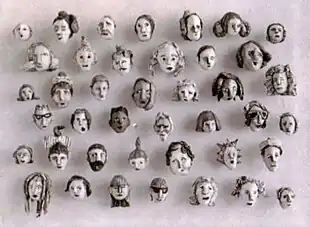 Beginning in 1997, Mastrangelo turned from large sculpture to small, expressive modeled and painted heads.[18][4] Between 1999 and 2006, she often exhibited them posted directly to walls in large groupings or grids (some numbering up to 350) that reviewers described as cross-sections or ethnographic-like presentations of human expression.[19][20][21][4] The heads were quickly jabbed and pinched out of clay, yet contained surprising specificity, including details such as dreadlocks, glasses, braids and bows.[19][21][6][22] On an individual level, critics noted them for their lumpy humor and unnerving emotional impact, while describing the effect en masse as both macabre and communal.[23][6][20][24] For the 2003, New York Vision Festival, Mastrangelo created an installation of large-scale, highly hung heads constructed out of plaster, wood, paint, burlap, hemp, wire and resin that reviewer Tina Seligman likened to departed souls or an ancient Greek chorus "silently echoing despair, anger, strength and resilience."[24] She also collaborated with poet Geoffrey O'Brien on an exhibition and book, Heads in Limbo (2011), in which he supplemented her heads with poignant, self-mocking and wise caption-verses.[6][25] In 2019, after turning to other work for more than a decade, she returned to the heads in installations at the City-Museum of Neuötting and Schauraum K3 in Germany.[26][18]