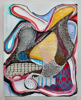 In 2020, while in seclusion due to the COVID-19 pandemic, Mastrangelo turned to knitting—initially for comfort, but eventually in extensions of her collage works.[8][7] She created vivid, visceral rectangular paintings in which materials such as yarn, upholstery cord and fabric took the leading role over paint.[1][30] Working intuitively, she "drew" on wood panels with upholstery cording of various weights using the energy of robust, sinuous lines to dictate the rhythms, biomorphic shapes and voids of the compositions (e.g., Shining Lights, 2021).[1][7][31] Over these drawings, she painted and collaged with patterned fabrics and meshes, developing a dense, complex pictorial vocabulary with trompe l'oeil, shadowing, depth and textural effects.[1][7] In an Artforum review of the solo show, "Safe At Home" (2021, 490 Atlantic), Barry Schwabsky wrote of this work, "These meshes expand, contract, twist and overlap, lending the compositions their delicious convolutions. More than a hundred years after the fact, Mastrangelo shows there’s still inspiration to be drawn from, of all things, Synthetic Cubism."[1]
