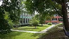 Sussex County Community College is located on a 167-acre (68 ha) hillside campus in Newton, New Jersey that features three ponds (including Horton Pond), and a stream that feeds into the Paulins Kill.[10][11][19][20] Located along Mill Street (also known as County Route 519) between Swartswood Road and Plotts Road, 88.63 acres of the campus are located within Newton, the remainder within neighboring Hampton Township.[21][22] Classes are held in five main academic buildings that feature approximately 60 classrooms, ten computer labs, ten science labs, an art studio, two art galleries, a small student theater and a larger 339-seat space that can be used as a theatre, lecture hall, and performing arts center.[19] The college has a library with over 37,000 bound volumes, 225 print periodicals, and database access to over 28,000 journals and periodicals.[9] SCCC has a television studio facility offering video streaming services for its SCCC/EDTV/20 cable access channel.[23] Further, it will soon launch radio broadcasts on WAMJ on 97.5 FM and 1620 AM.[24] The college also operates a Public Safety Training Academy on Sussex County government property located approximately 5 miles (8.0 km) north of the main campus in Frankford Township. The academy provides educational programs and training to local fire departments, the law enforcement community, emergency medical personnel, government employees, and the general public in all aspects of public safety.[25]