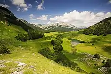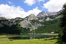 Trnovačko Lake, just outside the park and the borders of Bosnia and Herzegovina, is a glacial lake at an elevation of 1,500 metres (4,900 ft), is 700 metres (2,300 ft) long and 400 metres (1,300 ft) wide set amidst a "huge amphitheater of rocky peaks". The lake is drained from the Maglic, the Volujak, and the Bioc hill ranges. The north side of the lake, which is open, has the wooded Vratnice. The lake water is green-blue.[5][21] The plan is to form another national park within the borders of Montenegro, which should protect rest of the mountain range of Magilć-Volujak-Bioč and Trnovačko Lake. These two parks in neighboring countries should form one large transboundary protection zone.[2]