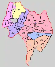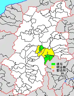 * yellow - areas formerly within the district borders during the early Meiji period
