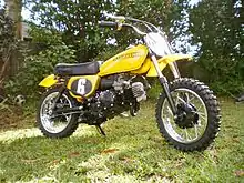The Suzuki JR50 is a miniature motorcycle with a 49 cc (3.0 cu in) displacement and a single-speed automatic transmission, using a centrifugal clutch and height adjustable suspension.[1][2] An oil injected two-stroke engine provides optimum lubrication and an oil level window makes it easy to see when a refill is needed. It is designed for children ages 5 to 12, and has been used for both racing and recreational riding. The JR50's engine was later used in the ALT50 and LT50 ATV's.