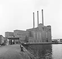 Svanemølle Power Station was built by Københavns Belysningsvæsen between 1947 and 1953 to supplement H. C. Ørsted Power Station in the Kongens Enghave. It was designed by Louis Hygom who had already carried out expansions and adaptions of the H. C. Ørsted plant in 1924 and 1932.