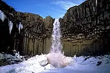 Svartifoss (Icelandic for "black waterfall", Icelandic pronunciation: [ˈsvar̥tɪˌfɔsː] ⓘ) is a waterfall in Skaftafell in Vatnajökull National Park in Iceland, and is one of the most popular sights in the park. It is surrounded by dark lava columns, which gave rise to its name.