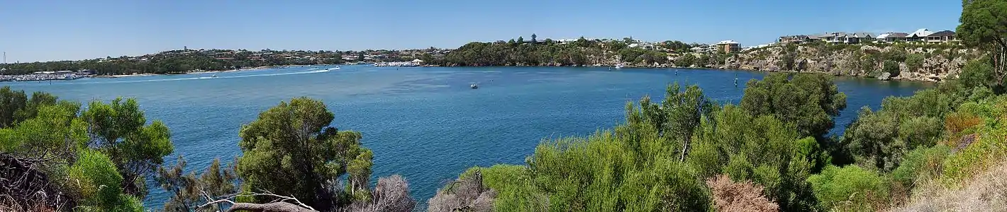 The Swan River estuary flows through the city of Perth. Its lower reaches are relatively wide and deep, with few constrictions, while the upper reaches are usually quite narrow and shallow.