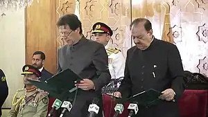 ![]() Imran Khan taking oath as 22nd Prime Minister of Pakistan alongside then President Mamnoon Hussain on 18 August 2018 | |
