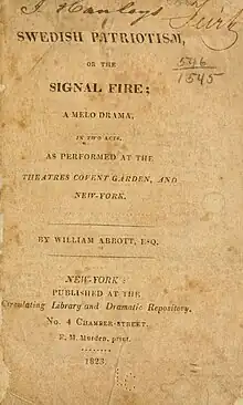 Swedish Patriotism is an 1819 stage melodrama by the British writer and actor William Abbot. It premiered at the Theatre Royal, Covent Garden on 19 May 1819.[1] [2] The London cast included Daniel Terry as Colonel Walstein, Abbot as Captain Albert, Maria Foote as Ulrica, John Liston as Walter, William Chapman as Cokaski, Charles Connor as Colonel Langstorff and Daniel Egerton as Count Cronstedt. It then appeared at the Park Theatre in New York on 1 December 1819 with Robert Maywood as Walstein.