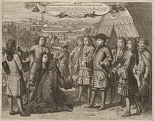 The situation was resolved with the Treaty of Altranstädt (1707) on 1 September, as Joseph I's allies persuaded him into making concessions to speed up Charles XII's departure from Saxony. The Protestants in Silesia had their rights restored according to the Peace of Westphalia—it was a compensation for Joseph's failure to hand over the Russians. Furthermore, Charles XII was promised that England and the Dutch Republic would recognize the previous treaty.[103] Charles XII departed Altranstädt the same day, with an army that was well-rested and larger than ever before.[104][105][106] The Russian campaign ended with its destruction in the Battle of Poltava and the subsequent Swedish Surrender at Perevolochna.[107]