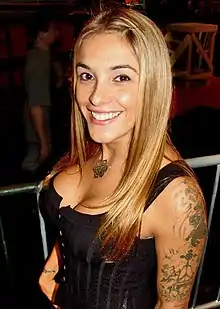 She was married to Ronan, her PUS bandmate, for 12 years until 1997,[8] after which she moved to Brasília to live with her grandfather, Alberto Perez.[1] Her appearance on Casa Dos Artistas in 2002 led to the end of her marriage to Daniel Sabbá due to a relationship that occurred during the show.[14] She had a daughter in 2008 with the fighter Eduardo Santoro.[6][15] She had a breast reduction when she was 18, and an enlargement 10 years later.[2] She practices jiu-jitsu.[2]