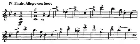 The work opens in G minor, and closes with a rousing peroration in C major. This tendency to move away from the original key to C major is the basis of the whole symphony's tonal structure, and displays for the first time Nielsen's hallmark compositional device, "progressive tonality." (Nielsen at one stage even thought of calling the work "Symphony in C".[3]) Simpson states "it is possibly the first symphony to end in a key other than that in which it started".[4]
