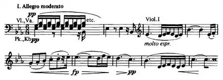 Many of Dvořák's early works seem to have Wagnerian influences, but this symphony is widely considered to be the most Wagnerian of them all.[5][9] Throughout the symphony his use of harp is particularly Wagnerian. The influence of Wagner is particularly notable in the second movement, where Dvořák seems to allude to motifs from Wagner's Ring Cycle, as well as using harmonies and orchestrations in the style of Wagner, particularly in the strings, harp, and brass.[10]