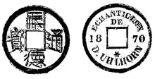 A company in Grevenbroich, Prussia originally founded by Diedrich Uhlhorn and at the time run by his son Heinrich Uhlhorn attempted to produce a machine-struck Tự Đức Thông Bảo cash coin, the pattern coin shows the manufacture date of 1870 although it is uncertain if the coin was actually produced in this year as no records mention it, the obverse inscription reads "Tự Đức Thông Bảo", the Chinese calligraphy on the coin comes very close for a person with no skills in writing Chinese characters as the coin was produced in North Germany.[15] While the reverse inscription reads "ECHANTILLON DE D. UHLHORN 1870" (Sample coin of D. Uhlhorn, 1870).[15] The coin weighs 4 grams to match the Vietnamese weight of 10 phần which is 3.7783 grams.[15] As it was deemed too expensive to ship these coins from North Germany to Saigon in French Cochinchina the effort to privately produce these coins was discontinued and all subsequent machine-struck cash coins produced were made by the French government.[15] It is possible that the coin was a test strike for Nguyễn Ðức Hậu who requested the court of the Nguyễn dynasty permission to purchase coin presses from Europe to produce machine-struck coins but this request was ultimate turned down by the court.[11] During this same period machine presses were being imported into the Qing dynasty where machine-struck cash coins would later become a common sight, while in Vietnam this wouldn't happen until the introduction of the Machine-struck Khải Định Thông Bảo (啓定通寶) in 1921.[11]