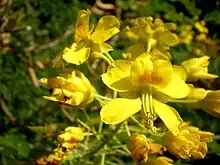 Mexican holdback is a small evergreen tree or large shrub, reaching a height of 3–4.6 m (9.8–15.1 ft) and a spread of 1.8–3 m (5.9–9.8 ft). Leaves are bipinnately-compound and dark green.[7] Each leaf has five to nine pinnae 4–9 cm (1.6–3.5 in) in length.[8] Pinnae are composed of four to five leaflets[7] that are 1–2.5 cm (0.39–0.98 in) long and 0.7–1.3 cm (0.28–0.51 in) wide.[8] Yellow, slightly fragrant flowers are produced on 7.6–15.2 cm (3.0–6.0 in) terminal spikes[7] of 10 to 30.[4] Blooming takes place from February to July, often continuing to October. The fruit is a dehiscent tan or yellow seedpod 5.1–7.6 cm (2.0–3.0 in) in length.[7]
