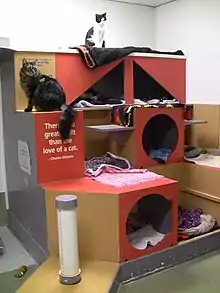 Tabby's Place acts as an adoption center, and hospital and hospice for cats.[5] Tabby's Place also provides annual open houses where pet owners can obtain microchip implants for their pets and learn from exhibitions and mini-classes in animal behavior.