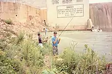 Kinetic tailrace fishing is angling with fishing rod and reel below a dam, spillway or weir or any structure which has a drop in elevation that causes turbulent or swift moving water at its base. An example would be Mission Valley Dam on the Guadalupe River on the northern end of Lake Dunlap in New Braunsfels, Texas. Free flowing rivers and streams which flow over a Dam structure are the most common types of dams that can provide tailrace fishing.