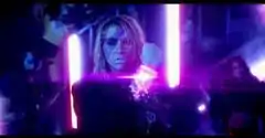 Kesha deflecting a laser beam shot from Star in the music video's choreographed dance battle sequence. The video was inspired by films from the 1980s.