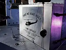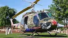 Take Me Home Huey is an art project[1] and sculpture that was manifested from a discarded U.S. Army Bell UH-1 Iroquois helicopter, that served as an air ambulance for the U.S. Army in the Vietnam War. The serial number is 67-17174, commonly known as #174. Artist Steve Maloney created the concept and artwork using the restored helicopter's 47-foot long fuselage as a canvas. The composition includes a mule pack of soldier's duffels, public address speakers and a vinyl wrap of Vietnam Helicopter Squadron names, along with symbolic 1960's and 70's pop culture imagery of icons that many soldiers longed for. The cockpit contains a time capsule of original veteran's artifacts, along with the abstract suspension of miscellaneous helicopter parts and instruments that were part of the original aircraft.[2]