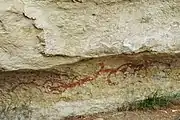 The Takiroa Historic Area features several Māori drawings made from ochre, bird fat, and charcoal.[2][3] The subject matter present in the shelter is variable. Some drawings have been interpreted as people and animals, such as birds.[4] Depictions of European settlers are also apparent, which feature the likes of horses and ships.[4]