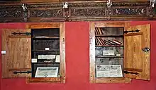 Two money closets were immured in the walls of the parlour. The closets' oak doors (oak is a very durable tree) have tinned iron hinges. These doors could have been locked because documents, money and other valuables were kept there. The town council had a town clerk position, whose task was to mark important things in documents and who, besides having beautiful handwriting, also had a good education. The accounting room, called kämmerei can be called the Ministry of Finance. An account of all the town's income and expenses was kept there. The treasury could be accessed only through the kämmerei. Treasured pewter, silverware, and other large-dimension treasures that did not fit in the closets of the parlour were stored there.[12]