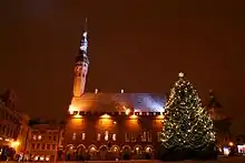 The Tallinn Town Hall (Estonian: Tallinna raekoda) is a building in the Old Town (Vanalinn) of Tallinn (Reval), Estonia, next to the Town Hall Square. The building is located in the south side of the medieval market square and is 36.8 metres (121 ft) long. The west wall is 14.5 metres (48 ft) in length, and the east is 15.2 metres (50 ft).[1] It is a two-storey building with a spacious basement.[2] It is the oldest town hall in the whole Baltic Sea region and Scandinavia.