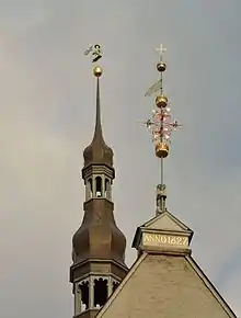 A salient octahedral tower, which is mostly built into the building and leans on the wall, rises from the building's eastern gable. It was built in 1627–28 by G. Graff. It has a three-piece baroque spire with open galleries. The tower is 64 metres high. The spire was built in 1627, but obtained its final shape in 1781 and was also reconstructed in this shape in 1952 after its destruction during World War II (architect A. Kukkur).[3][4] The spire is in Late Renaissance style.[4]