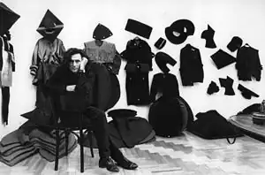 Király's career as an independent fashion designer coincided with Hungary's experiment in "Goulash Communism"—integrating free-market elements to the socialist command economy and loosening political censorship restrictions.[7] He initially sold his creations out of New Art Studio, an underground boutique in central Budapest, whose main founder was his mentor, Koppány.[5] Though "his store did not have a sales counter, and customers were received at extreme opening hours", it was a major success, with queues of customers meandering around the street-corner.[8] Király also flaunted convention by using live models in the display window.[1] Beginning in 1981, he organized "fashion walks" on Váci Street, an upscale fashion district in central Pest, in which his friends would dress up in outre outfits without permits,[9] including trash bags and bank notes.[10][1] His first fashion show was at the Fiatal Művészek Klubja (FMK; "Club for Young Artists") in 1983.[1] Király often showcased his works at the Petőfi Csarnok, a large community center with a concert hall.[9][11] The runway shows he held there, which he called "fashion performances," incorporated elements of contemporary dance and performance art.[12][9] He also collaborated with theater groups starting in the 1980s, most famously designing white- and cream-colored costumes evoking the phantasmagoric atmosphere of A Midsummer Night's Dream for a reinterpretation by the Baltazar Theatre, a company of intellectually disabled actors.[9]