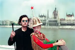 After a "chance encounter" during one his frequent travels in West Berlin,[5] Király was co-opted as a costume designer for Az Emberevő szerelme ("A Man-eater's Love"), a 1984 film produced by Mafilm and ZDF.[13] In 1988, he presented at the Dressater fashion show in West Berlin as the only designer from an Eastern Bloc country, having been recruited by Vivienne Westwood.[9][14] According to a 1989 piece in Reform magazine, his approach in preparation for that event was: "Be so challenging that they go out and kill for you".[15] He called his collection, which featured black velvet dresses stretched into geometric shapes,[16] "Open Doors," a subtle jab at the Soviet authorities who had granted him permission to attend in an attempt to demonstrate their openness.[9] It was extremely well-received, bringing him fame in the Western world.[17] In 1990, fellow artist Gábor Szerényi reported his "patriotic pride" at seeing Király featured and advertised "in capital letters" by Vogue México.[18]