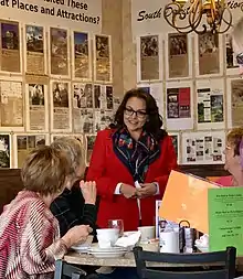 Tamara St. John campaigning during Election Day at Pereboom's Cafe in Webster, SD.