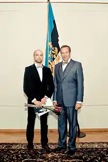 ![]() Tanel Veenre receiving Young Cultural Figure Award in 2012 from Toomas Hendrik Ilves | |